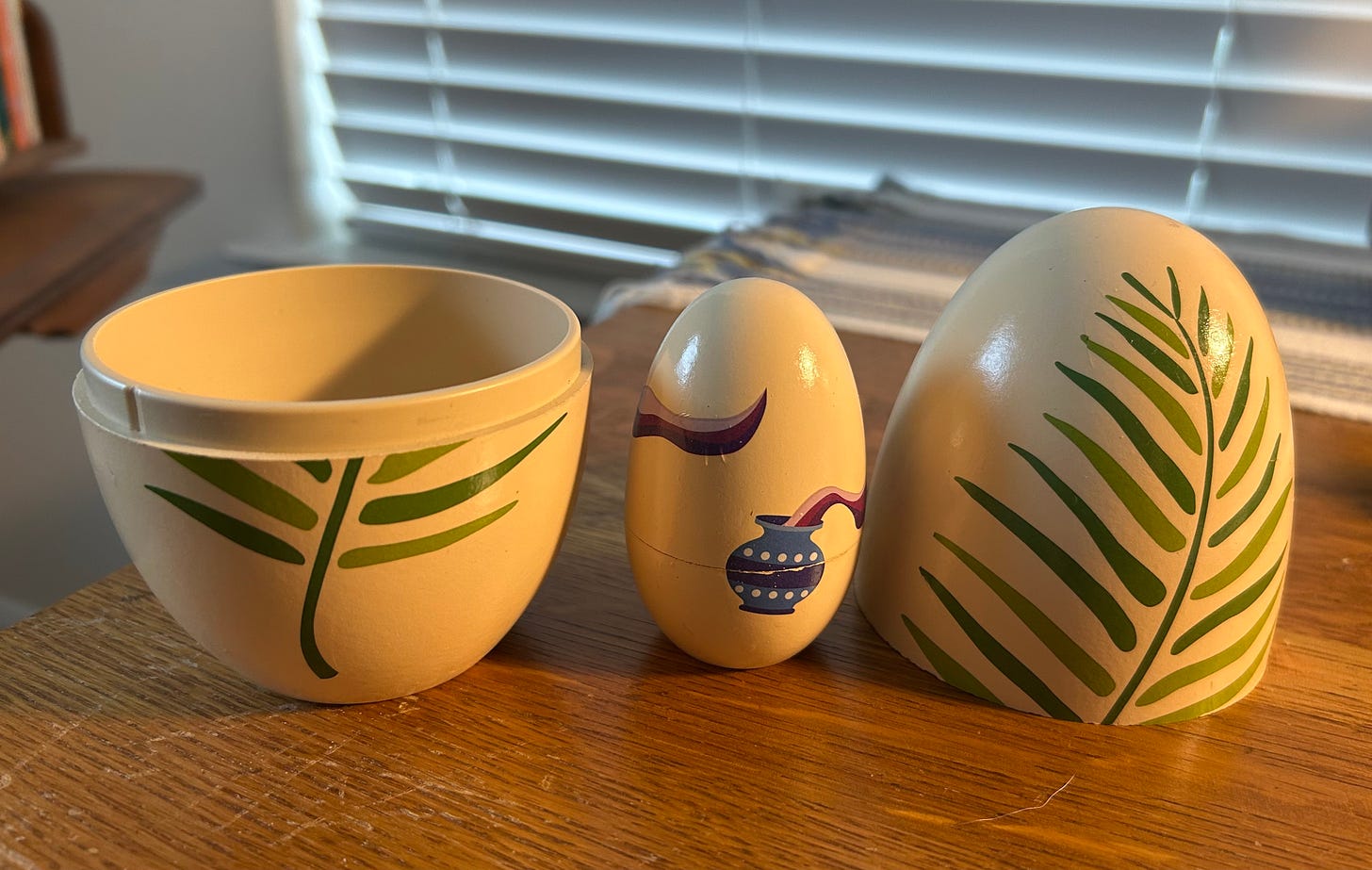 Last year when I retired, I made a couple of perhaps extravagant purchases. One of them was a new and more expensive communion kit, and another was a Holy Week/Easter book and “Nesting Doll” Egg for children. The pictures on the egg bore a symbol for each day of Holy Week, starting with Palm Sunday. Last year, I took the egg with me to Minnesota. That was my Holy Week discipline. On Sunday, there was a Palm For Palm Sunday. On Monday, the image was for the temple that Jesus entered, and drove out the money-changers. On Tuesday there was an image of a heart, to remind us that between Palm Sunday and his arrest, Jesus was teaching in the temple, and that one of his teachings was the greatest commandment, “Love God with all your heart, with all your soul, and with all your mind, and with all your strength, and to love your neighbor as yourself.”